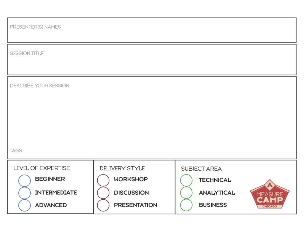 Blank session cards will be available at the event, or you can download a blank card, fill it out, and bring it with you to MeasureCamp.